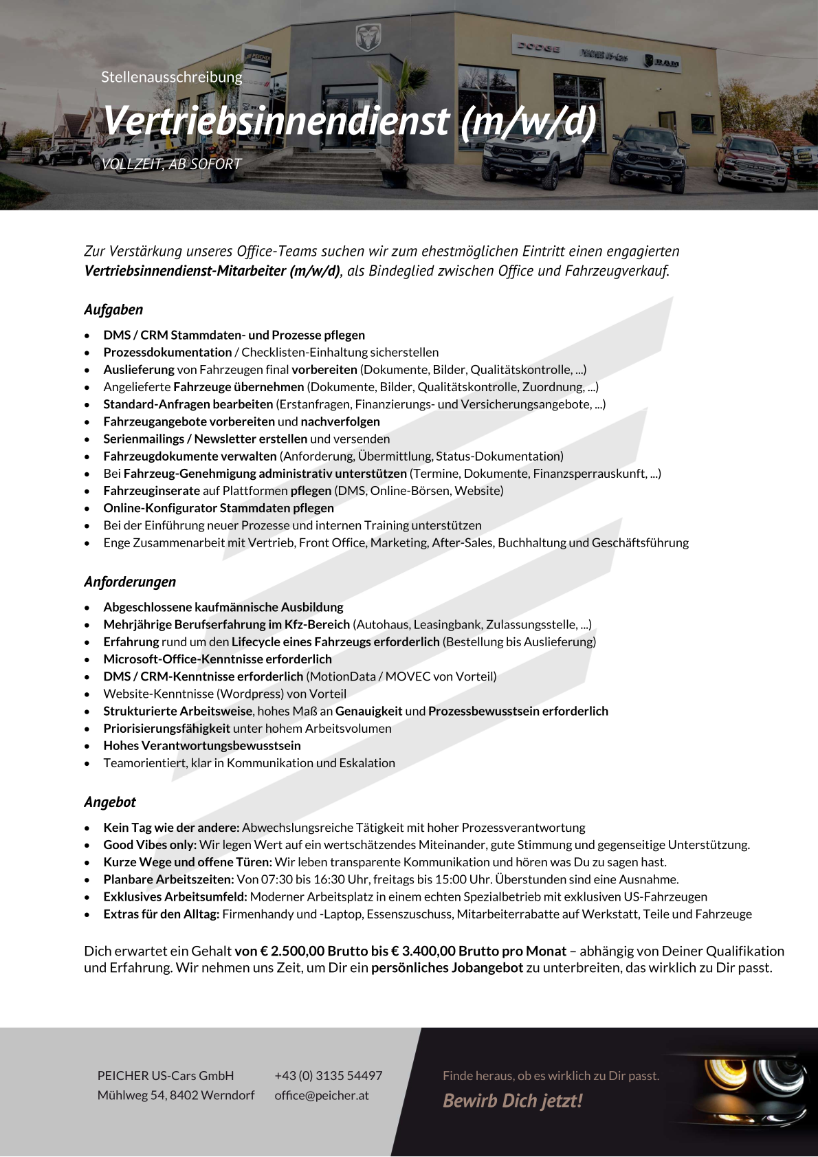 Zur Verstärkung unseres Office-Teams suchen wir zum ehestmöglichen Eintritt einen engagierten Vertriebsinnendienst-Mitarbeiter (m/w/d), als Bindeglied zwischen Office und Fahrzeugverkauf.
